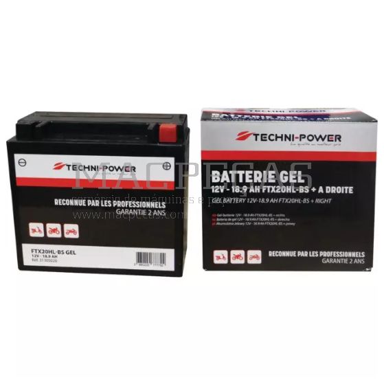 Bateria de gel Techni-Power FTX20HL-BS é uma escolha avançada para motocicletas, scooters, quadriciclos, SSV UTVs, motos de neve e jet-skis. Com tecnologia de gel, oferece 12V e 18.9Ah, sendo compacta (175mm x 87mm x 155mm) e de polaridade + direita. O modelo pesa 6 kg, possui terminal quadrado e é embalado a granel. Ideal para desempenho confiável e duradouro. Gencod: 3660220777792.