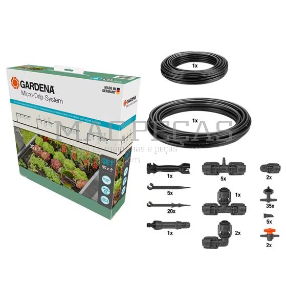 Gardena Druppelirrigatie-Set GA13455 — conjunto completo do sistema Micro-Drip ideal para a rega eficiente e uniforme de plantas, canteiros e culturas sensíveis. O tubo de gotejamento possui emissores integrados e pode ser utilizado tanto à superfície como enterrado. Graças à tecnologia autolimpante de labirinto e à proteção anti-raízes, evita entupimentos. Os gotejadores são compensadores de pressão, garantindo uma irrigação constante mesmo em terrenos irregulares. O sistema pode ser facilmente expandido e automatizado com um programador de rega Gardena.