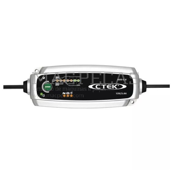 Carregador CTEK MXS 3.8 com 3 programas e corte automático, ideal para baterias de chumbo (0,8 a 130 Ah). Proteção IP65, dimensões compactas e cabo de 1,4 m. Perfeito para motos, quads e veículos.