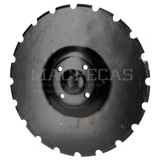 Disco oco 159937N de 410 mm de diâmetro exterior e 5 mm de espessura, tipo côncavo serrilhado, ideal para grades de discos, arados e semeadoras. Fabricado em aço resistente, possui 4 furos de fixação e 20 saliências que garantem tração e estabilidade no solo durante o trabalho agrícola. Perfeito para substituir discos originais, oferecendo durabilidade e desempenho eficientes.