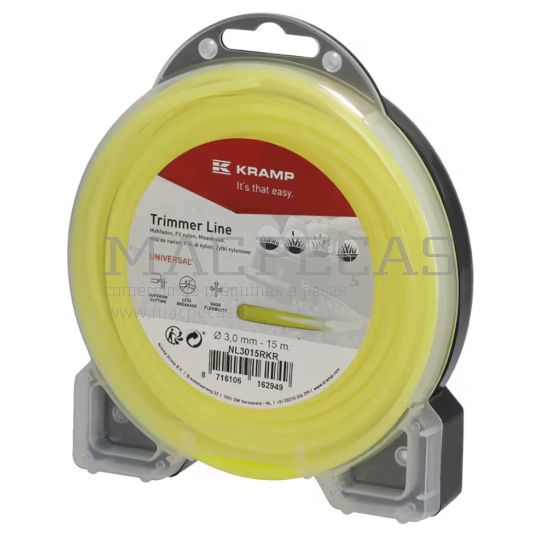 Fio de cortar Kramp com 3 mm de diâmetro e 15 metros de comprimento, perfil redondo e cor amarela. Este é o fio universal mais comum, ideal para utilização geral em diversos tipos de aparadores e roçadoras. Adequado tanto para utilizadores domésticos como para uso semi-profissional, oferece bom desempenho em cortes de vegetação média. A sua forma redonda reduz o desgaste e proporciona um corte consistente. Produto embalado em formato donut para fácil manuseio e armazenamento. Fiável, resistente e eficiente na manutenção de jardins e áreas verdes.
