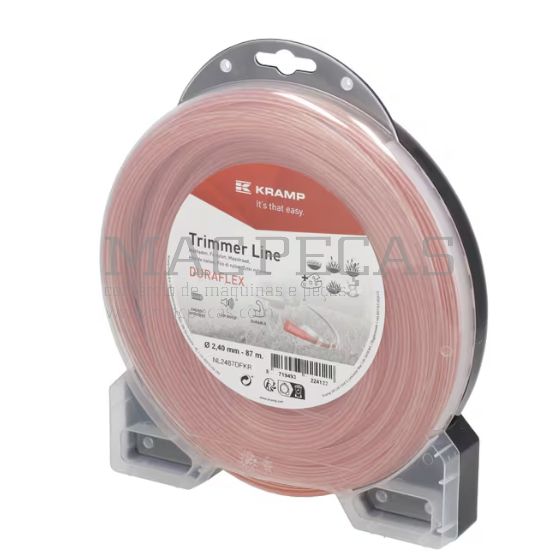O fio de corte Duraflex da Kramp, com 2,4 mm e 87 m, é ultrarresistente, com tecnologia Dual Action para máxima durabilidade, cortes precisos e menos ruído. Ideal para utilizadores exigentes e todo o tipo de vegetação, mesmo em roçadoras a bateria. Possui núcleo amortecedor, revestimento protetor e perfil aerodinâmico que garante estabilidade, menos vibrações e maior longevidade face aos fios tradicionais.