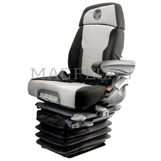 O Banco GRAMMER Maximo Dynamic Plus, adequado para Deutz V1, destaca-se pela sua suspensão pneumática e estofamento em tecido de alta qualidade. Equipado com um interruptor de contacto opcional e consola de joystick, oferece ajuste automático do peso do utilizador e sistema de cinto integrado. Com uma largura de 565 mm, o banco inclui suporte lombar pneumático e aquecimento de dois estágios. O design inovador inclui o Sistema de Amortecimento Dinâmico (Dynamic Damping System), prolongamento de encosto Dualmotion e ajuste de altura pneumático contínuo de 80 mm. A suspensão horizontal longitudinal e lateral garantem conforto adicional, enquanto o adaptador giratório permite uma rotação de 7,5° para a esquerda e 15° para a direita, proporcionando uma visibilidade perfeita e controlo seguro do veículo. Além disso, o banco possui uma bolsa de armazenamento prática, ajuste de inclinação do encosto e profundidade ajustável. Ideal para máquinas agrícolas, combina conforto, funcionalidade e tecnologia avançada.