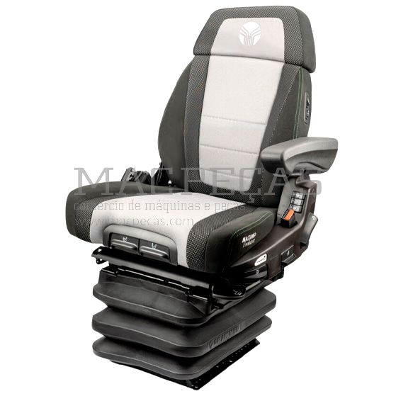 Modelo: O Maximo Evolution Dynamic com sistema de amortecimento dinâmico estabelece o padrão de conforto de suspensão para bancos com suspensão passiva para tractores médios e grandes. O apoio de costas adaptável Dualmotion apoia as costas e, em conjunto com o adaptador giratório, proporciona a melhor visibilidade e apoio quando se trabalha para trás. A regulação do contorno lateral da almofada das costas permite uma adaptação ainda mais individualizada do banco à estatura do respetivo corpo. Com a regulação eletrónica do peso, o assento ajusta-se automaticamente ao peso do condutor. O conforto perfeito dos bancos é assegurado pelo controlo ativo da climatização dos bancos, que elimina a humidade do corpo. Opcionalmente, os apoios de braços multifuncionais podem ser ligados através de várias placas adaptadoras.