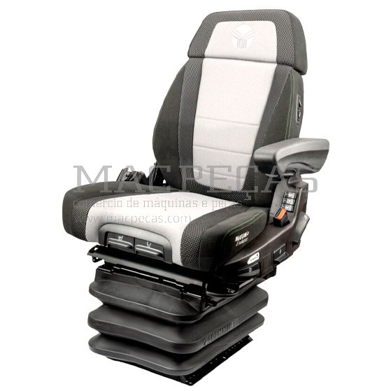 Modelo: O Maximo Evolution Dynamic com sistema de amortecimento dinâmico estabelece o padrão de conforto de suspensão para bancos com suspensão passiva para tratores médios e grandes. O apoio de costas adaptável Dualmotion apoia as costas e, em conjunto com o adaptador giratório, proporciona a melhor visibilidade e apoio quando se trabalha para trás. A regulação do contorno lateral da almofada das costas permite uma adaptação ainda mais individualizada do banco à estatura do respetivo corpo. Com a regulação eletrónica do peso, o assento ajusta-se automaticamente ao peso do condutor. O conforto perfeito dos bancos é assegurado pelo controlo ativo da climatização dos bancos, que elimina a humidade do corpo. Opcionalmente, os apoios de braços multifuncionais podem ser ligados através de várias placas adaptadoras.