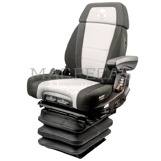 Modelo: O Maximo Evolution Dynamic com sistema de amortecimento dinâmico estabelece o padrão de conforto de suspensão para bancos com suspensão passiva para tractores médios e grandes. O apoio de costas adaptável Dualmotion apoia as costas e, em conjunto com o adaptador giratório, proporciona a melhor visibilidade e apoio quando se trabalha para trás. A regulação do contorno lateral da almofada das costas permite uma adaptação ainda mais individualizada do banco à estatura do respetivo corpo. Com a regulação eletrónica do peso, o assento ajusta-se automaticamente ao peso do condutor. O conforto perfeito dos bancos é assegurado pelo controlo ativo da climatização dos bancos, que elimina a humidade do corpo. Opcionalmente, os apoios de braços multifuncionais podem ser ligados através de várias placas adaptadoras.