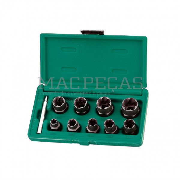 Jogo de extrator de fêmeas danificadas com 9 peças 3/8”Medidas: 10; 11; 12; 13; 14; 15; 16; 17 e 19