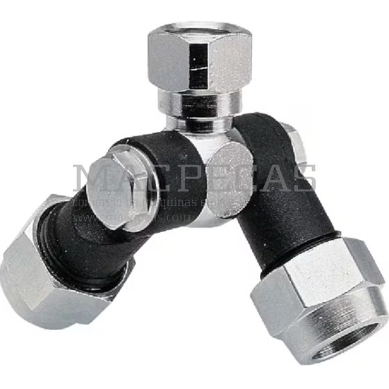 Porta-bicos Braglia 264612167 com 2 saídas, ideal para pulverização com inseticidas, fungicidas e herbicidas, bem como aplicações industriais. Fabricado com materiais de alta resistência como latão niquelado, inox e PA66, é ajustável até 270° e possui vedação com O-ring para máxima fiabilidade. Suporta alta pressão (até 20 BAR) e inclui controlo anti-gotejamento, com roscas NPTF e BSP para versatilidade de montagem.