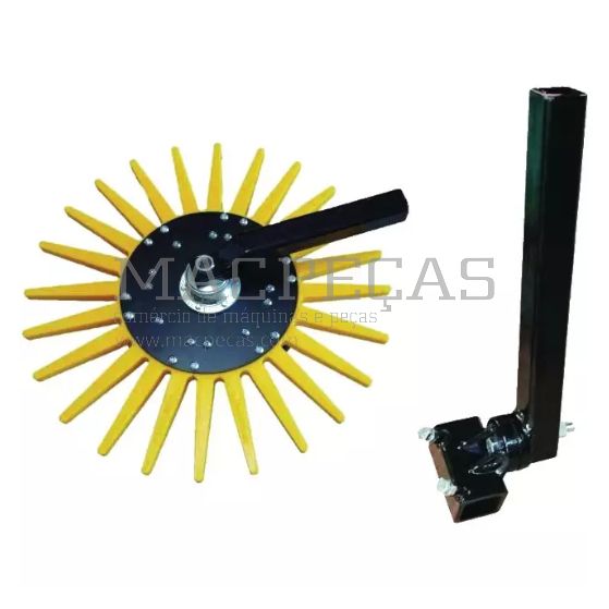 Kit de enxada para arboricultura e viticultura com disco de Ø1000 mm e estrutura média amarela. Possui viga principal reforçada com 500 mm de altura. Inclinação e desvio ajustáveis para melhor adaptação às necessidades do terreno. Compatível com todas as máquinas agrícolas e vinícolas. Ideal para espaçamentos entre regos a partir de 210 cm e velocidades de trabalho entre 4 e 15 km/h. Fornecido a granel.