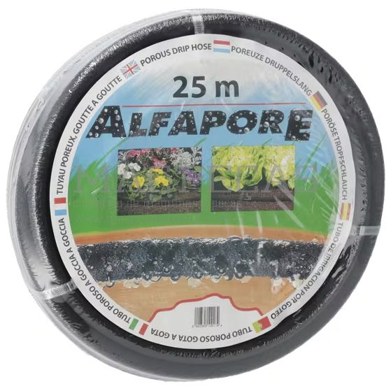 AlfaFlex SL555025 — mangueira porosa de rega por gotejamento Alfapore com 25 metros de comprimento. Uma solução eficiente, económica e amiga do ambiente para a irrigação de flores, plantas, sebes e arbustos. Pode ser instalada à superfície ou enterrada, garantindo uma rega uniforme e controlada. Inclui uniões rápidas compatíveis com sistemas de engate Gardena.