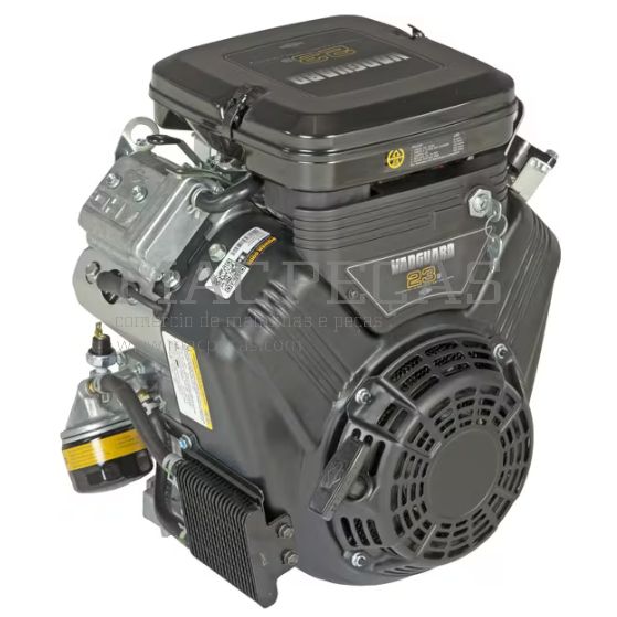 Motor Briggs & Stratton Vanguard com 627 cm³, 2 cilindros e potência máxima de 23 cv. Inclui arranque elétrico e manual (posição da manivela às 9h), cambota reta horizontal com 76 mm de comprimento e 25,4 mm de diâmetro. Volante pesado, bomba de combustível e filtro de óleo integrados. Ideal para aplicações industriais. Sem depósito nem escape incluídos.