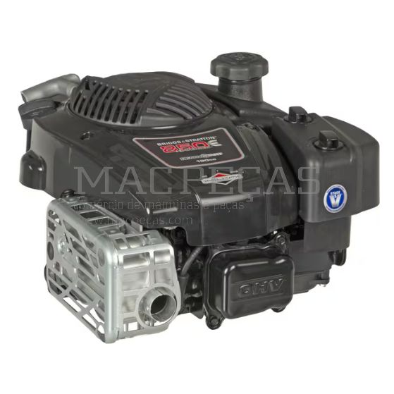 Motor Briggs & Stratton modelo 850 a gasolina com 190 cm³ e potência máxima de 6.5 HP (4.8 kW). Apresenta cambota reta vertical de 80 mm de comprimento e 25 mm de diâmetro, arranque por rebobinador, sistema de ignição OHV e refrigeração a ar. Inclui depósito de combustível de 1.14 litros e tubo de escape. Peso leve de 13.38 kg, compatível com o código original 123P02-0074-H5.