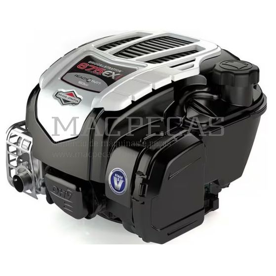 Motor Briggs & Stratton 675EXi Series com 5,4 cv (4 kW), 163 cm³, veio vertical reto de 62 mm x 22,2 mm (7/8"), sistema OHV, arranque manual, com escape e depósito de 1 L. Ideal para corta-relvas e equipamentos de jardinagem com alta durabilidade e baixa manutenção.