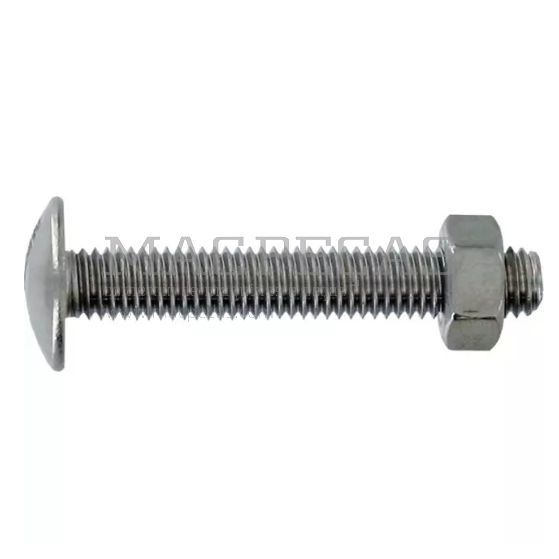 Parafuso de cabeça abaulada 8x20 mm em aço inoxidável A2 com rosca total e passo de 1.25 mm. Fabricado segundo a norma NFE 27128. Inclui porcas. Fornecido em blister com 10 unidades. Ideal para aplicações em ambientes húmidos ou corrosivos, oferecendo resistência e durabilidade.