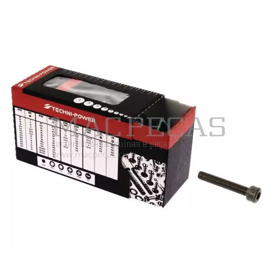 Parafuso de cabeça cilíndrica com sextavado interior 6x30 mm, fabricado em aço bruto de elevada resistência classe 12.9, com rosca total e passo de 1 mm. Conforme a norma DIN 912, é ideal para montagens técnicas e industriais que exigem força, precisão e fiabilidade. Caixa com 50 unidades da marca Techni-Power.