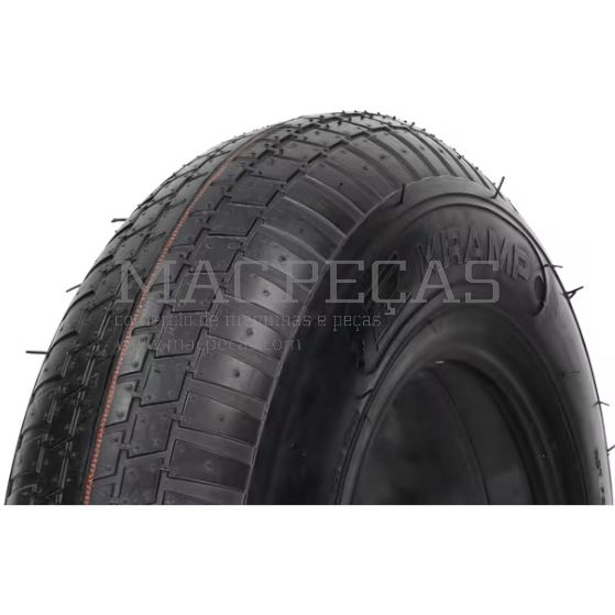 Pneu Kramp 4.80/4.00-8 com diâmetro exterior de 390 mm e largura de 103 mm, ideal para diversas aplicações. Suporta até 220 kg com pressão máxima de 2,5 bar. Composto por 4 camadas e equipado com válvula TR13, garante durabilidade e performance superior.