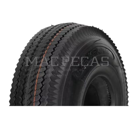 Pneu Kramp 4.10x3.50-4 com piso S-389 e válvula TR87. Capacidade até 105 kg, 4 camadas e 2,1 bar de pressão máxima. Ideal para jantes de 4 polegadas.