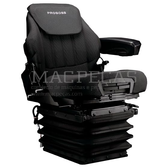 O banco PROBOSS AS3520, compatível com equipamentos Fendt, destaca-se pela sua suspensão pneumática, estofamento em tecido e ajustes personalizáveis. Com apoios de braços Comfort Plus e rotação de até 20°, oferece conforto e ergonomia para longas horas de trabalho. Possui também suporte lombar e ajuste de altura contínuo, garantindo uma experiência de condução ergonómica.