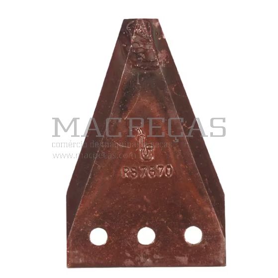 Número do produto RS7670 da marca Schumacher, com 80 mm de comprimento, 51 mm de largura e 2,7 mm de espessura. Diâmetro do furo de 5,5 mm, distância de 10 mm da base ao centro dos furos de montagem e 27 mm da base até o corte. Produto vendido por peça, ideal para manutenção agrícola precisa.